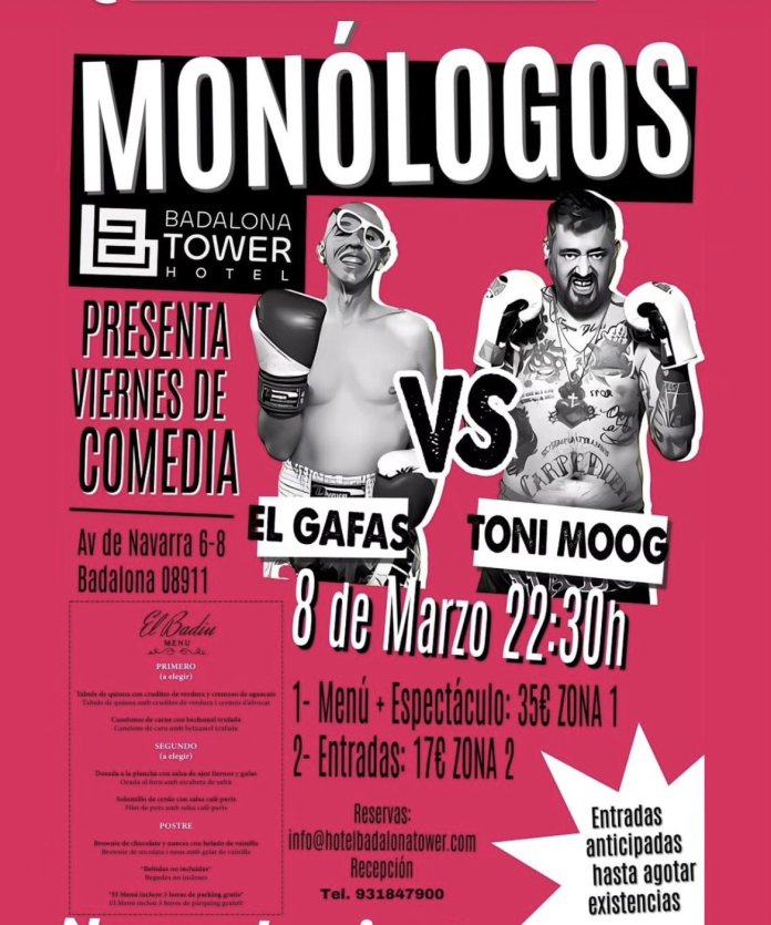 Amb el canvi de propietaris de l’antic Rafael Hoteles, ara Badalona Tower, l’hotel s’ha renovat, tant d’estètica com d’obertura a la ciutat. Són moltes les entitats de la ciutat que ja estan utilitzant les seves sales per fer actes, com una festa de Carnaval, o el mateix Ajuntament fa realitzar l’acte d’agraïment dels voluntaris i voluntàries de la Cavalcada al mateix hotel. Ara el Badalona Tower fa un pas endavant i proposa una nit de monòlegs i sopar la nit del 8 de març, a partir de les 22:30h on actuaran El Gafas i Toni Moog. La proposta inclou un sopar. Podeu fer les reserves i més informació a [email protected]