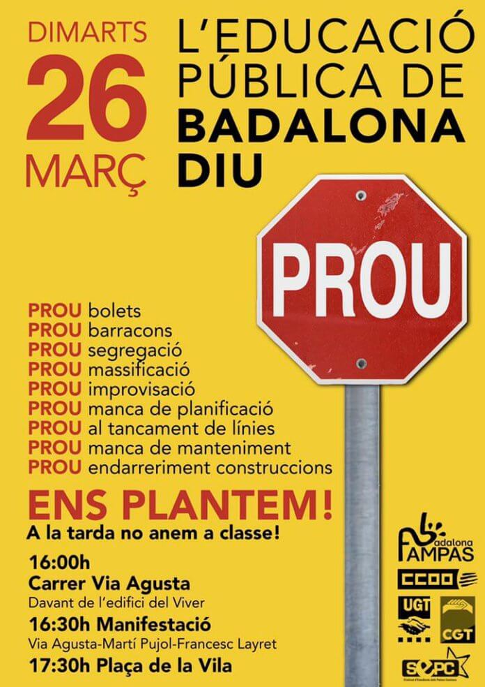 UGT, CGT i CCOO han convocat una manifestació el aquest dimarts, 26 de març, per reclamar una educació pública de qualitat. La manifestació arrencarà a les 16h, davant de l’edifici del Viver, a la Via Augusta. La manifestació es preveu molt participativa i pot afectar el trànsit, durant la tarda, al Centre de Badalona.