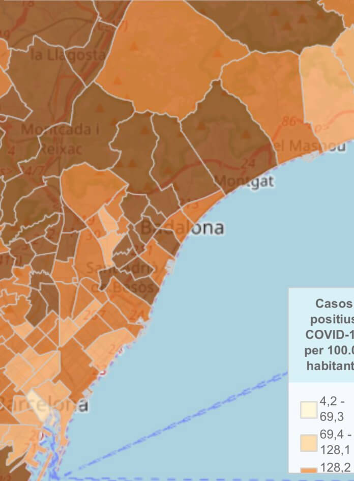 Un mapa elaborat per la Generalitat de Catalunya, dividit per àrees bàsiques, permet saber quantes persones han donat positiu per àrees bàsiques de tot el país, també de Badalona. Les dades permeten saber quantes persones han donat positiu en la Covid-19 a la ciutat, i per barris, però està clar que aquesta xifra “oficial” no és real perquè a moltes persones no s’han practicat cap mena de test. Els experts afirmen que aquestes dades s’haurien de multiplicar per tres. Podeu consultar tot el mapa complet en aquest enllaç, http://aquas.gencat.cat/.content/IntegradorServeis/mapa_covid/atlas.html