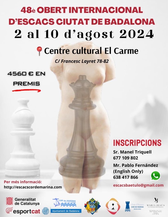Del 2 al 10 d’agost, Badalona acollirà el 48è Torneig Internacional d’Escacs de Badalona. Enguany, el torneig tindrà lloc al CC del Carme, al carrer Francesc Layret.