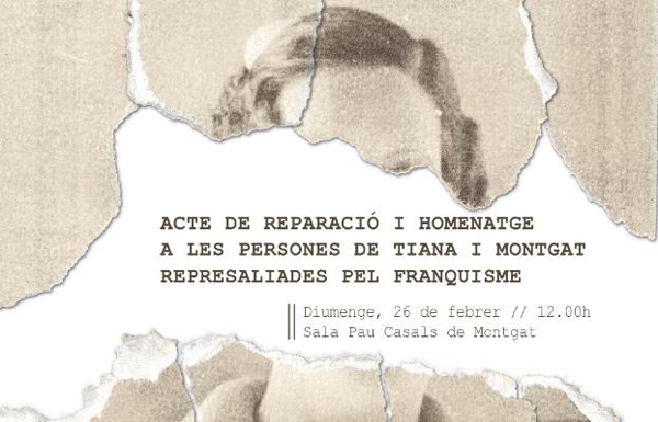 Els ajuntaments de Montgat i Tiana han organitzat un acte conjunt que es celebrarà diumenge 26 de febrer a les 12 h a la Sala Pau Casals. En el transcurs de l’acte es lliurarà el document oficial de reparació jurídica de les víctimes del franquisme als familiars de les persones represaliades que consten a la llista elaborada per l’Arxiu Nacional de Catalunya. Amb el lliurament d’aquest document oficial es vol deixar constància de la nul·litat d’aquestes sentències i resolucions, emanades d’uns tribunals il·legals. A la llista hi ha 44 persones nascudes o que vivien a Tiana, i 127 persones residents o que vivien a Montgat.