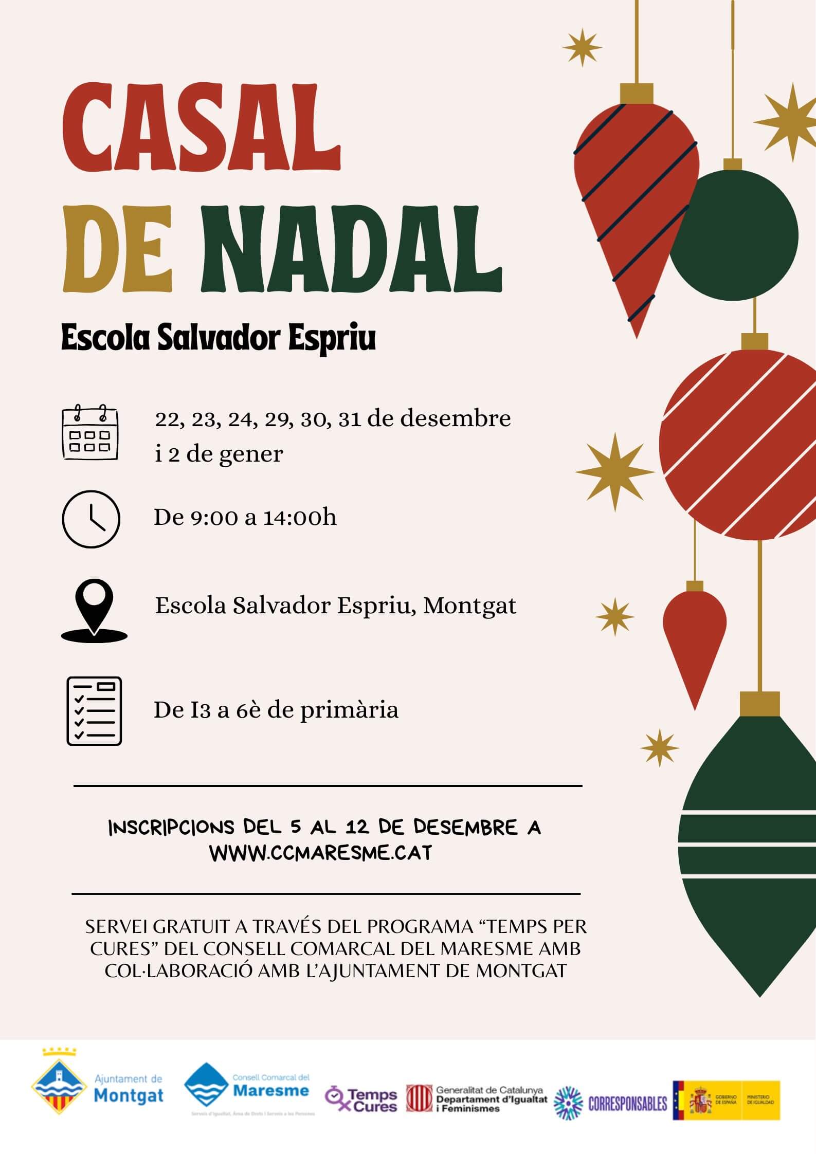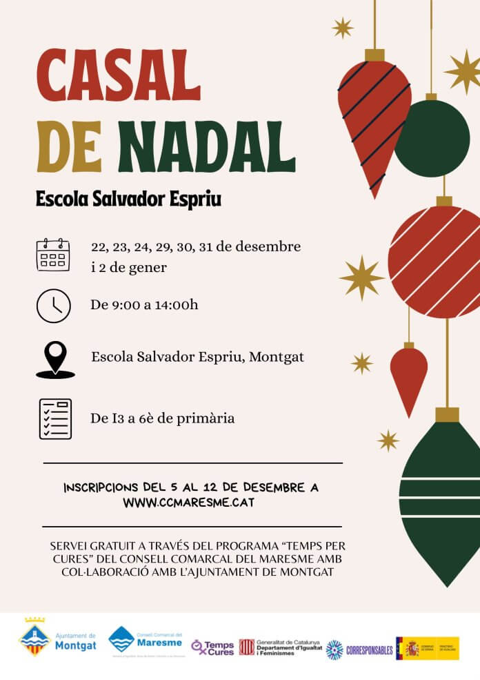 L’Ajuntament de Montgat, juntament amb el programa Temps x Cures del Consell Comarcal del Maresme, organitza un Casalet de Nadal gratuït adreçat a infants de 3 a 12 anys, amb l’objectiu de donar suport a les famílies durant les vacances escolars i afavorir la conciliació de la vida laboral, familiar i personal.