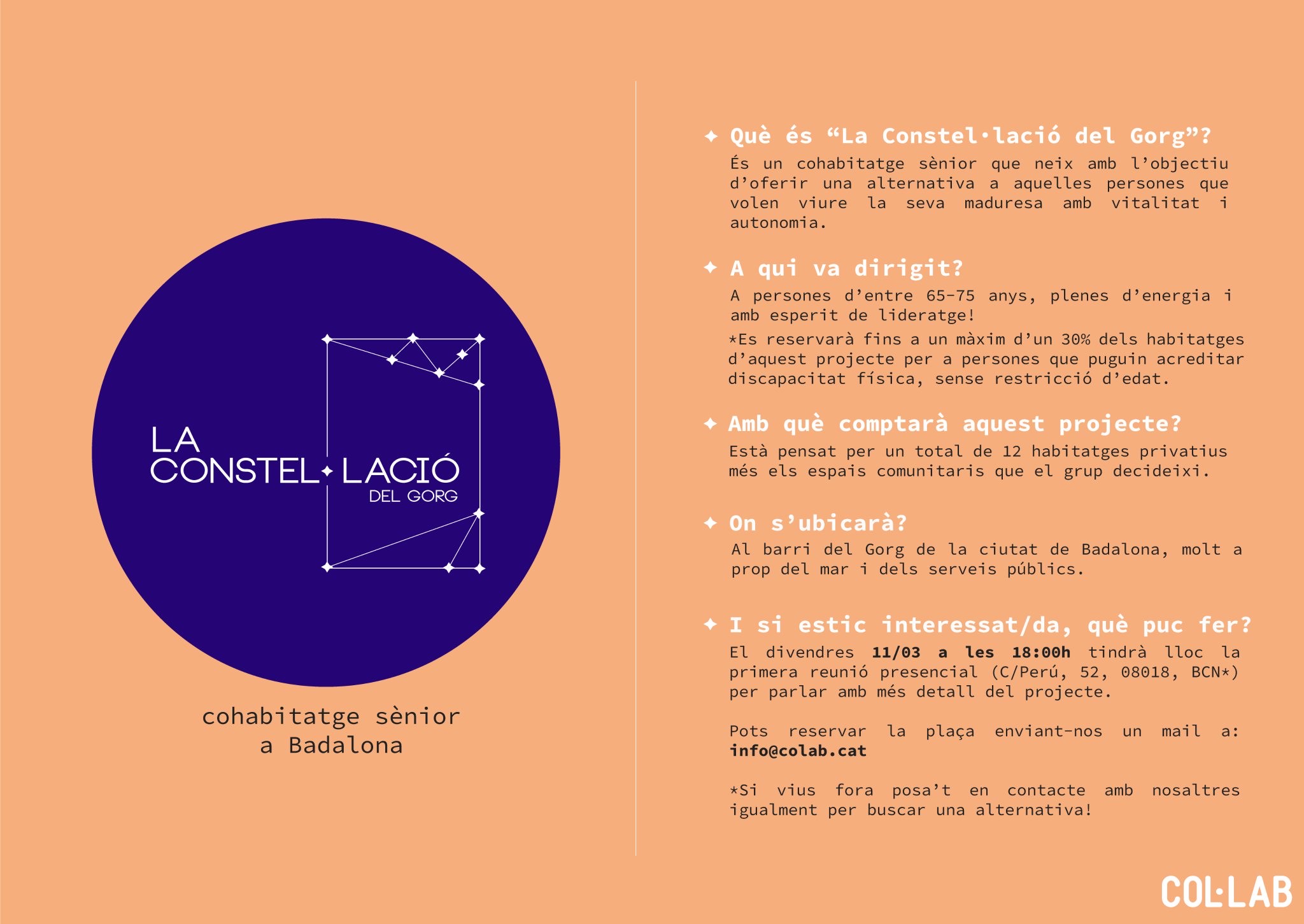 Aquest divendres, 11 de mar, serà presentat el projecte “La Constel·lació del Gorg”. Es tracta d’uns nous habitatges per la gent gran que neix amb l’objectiu d’oferir una alternativa a aquelles persones que volen viure acompanyades. El projecte va dirigit a persones d’entre 65 i 75 anys, una part d’elles que tinguin una discapacitat física, sense restricció d’edat. En total seran 12 habitatges privatius més els espais comunitaris. El projecte estarà ubicat al barri del Gorg. Justament, aquest divendres 11 de març, a les 18h, tindrà lloc la primera reunió per presentar “La Constel·lació del Gorg”. Serà al carrer Perú, 52 de Barcelona. Per reservar plaça pots enviar un correu al [email protected]