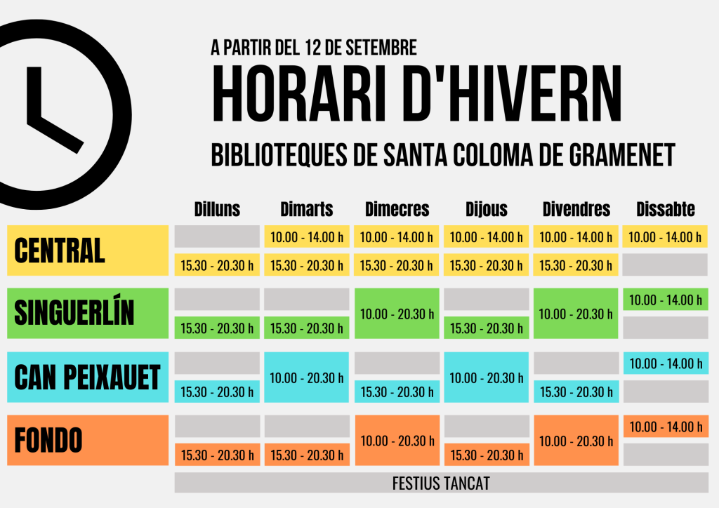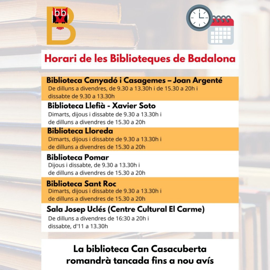 Totes les biblioteques de Badalona avancen 30 minuts el seu horari a partir d’aquest dilluns 9 de gener. Aquest canvi d’horari és una demanda dels treballadors que exigien un avançament en el seu horari. Per altra banda, la biblioteca de Can Casacuberta romandrà tancada amb previsió d’obertura pel proper 13 de febrer.