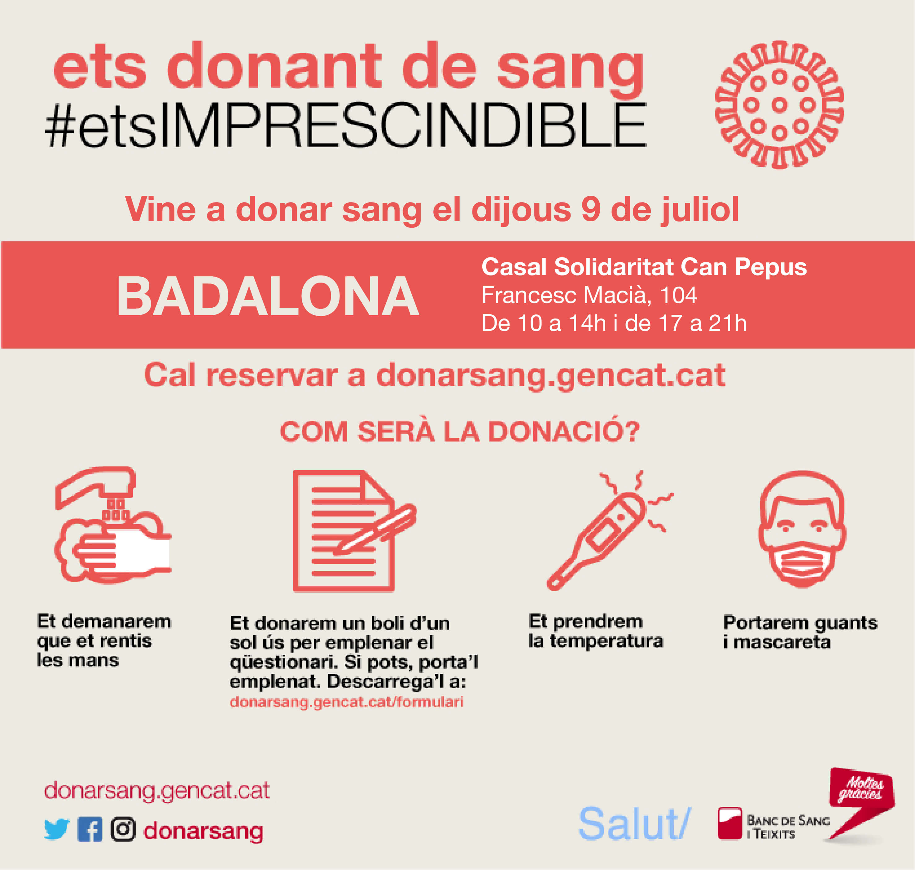 Aquesta setmana s’ha organitzat una nova donació de sang, dijous 9 de juliol al Casal de la Solidaritat Can Pepus, al carrer Francesc Macià. La donació tindrà lloc de 10 a 14h i de 17 a 21h. Les persones que vulgujn donar sang hauran de fer una pre reserva al següent enllaç web; https://www.donarsang.gencat.cat/es/?platform=hootsuite