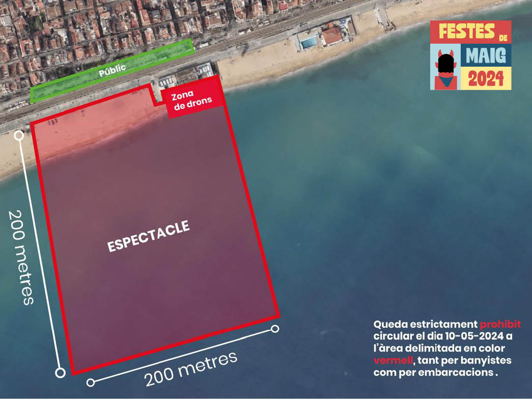 Aquest espectacle, que omplirà el cel amb singulars formes geomètriques, algunes especialment creades per a l’ocasió amb referències als símbols i icones de Badalona, requereix d’un perímetre marítim de seguretat que comprèn la platja dels Pescadors, des de l’alçada del carrer d’en Prim fins a l’alçada del carrer de Mar, i que s’endinsa uns 200 metres de la línia de la costa. Per tal de vetllar pel compliment d’aquesta mesura hi haurà control policial.