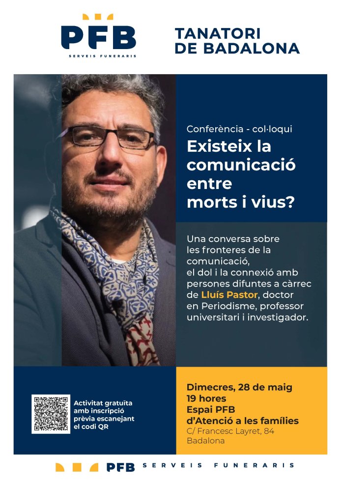 PFB Serveis Funeraris i el Tanatori de Badalona organitzen la conferència-col·loqui Existeix la comunicació entre morts i vius?, a càrrec de Lluís Pastor, doctor en Periodisme, professor universitari i investigador, que tindrà lloc el dimecres 28 de maig a les 19 hores a l’Espai PFB d’Atenció a les Famílies del centre de Badalona (c/ Francesc Layret, 84). En el marc d’aquest acte, Pastor explorarà les formes en què les persones intenten mantenir vincles amb éssers estimats després de la mort -un fenomen que succeeix a un 30% de la població mundial- i el sentit que aquesta comunicació pot tenir en els processos de dol, una qüestió que l’expert ha analitzat a fons en el seu darrer llibre Los mismos muertos vuelven (2025).