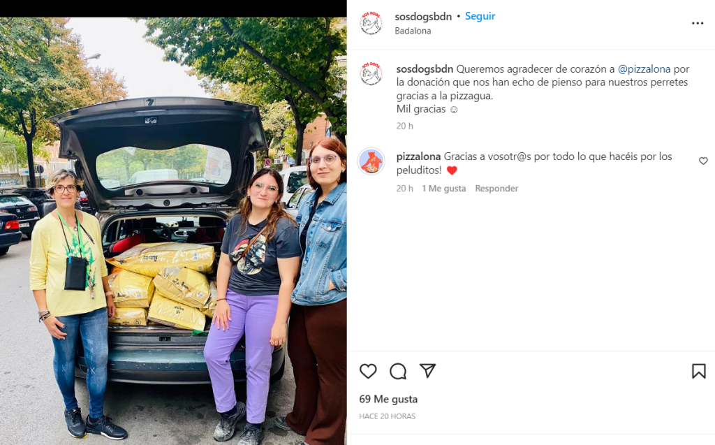 La mateixa protectora Sos Dogs BDN ho ha anunciat al seu compte d’Instagram: “Volem agrair de cor a Pizzalona per la donació que ens han fet de pinso per als nostres gossets”.