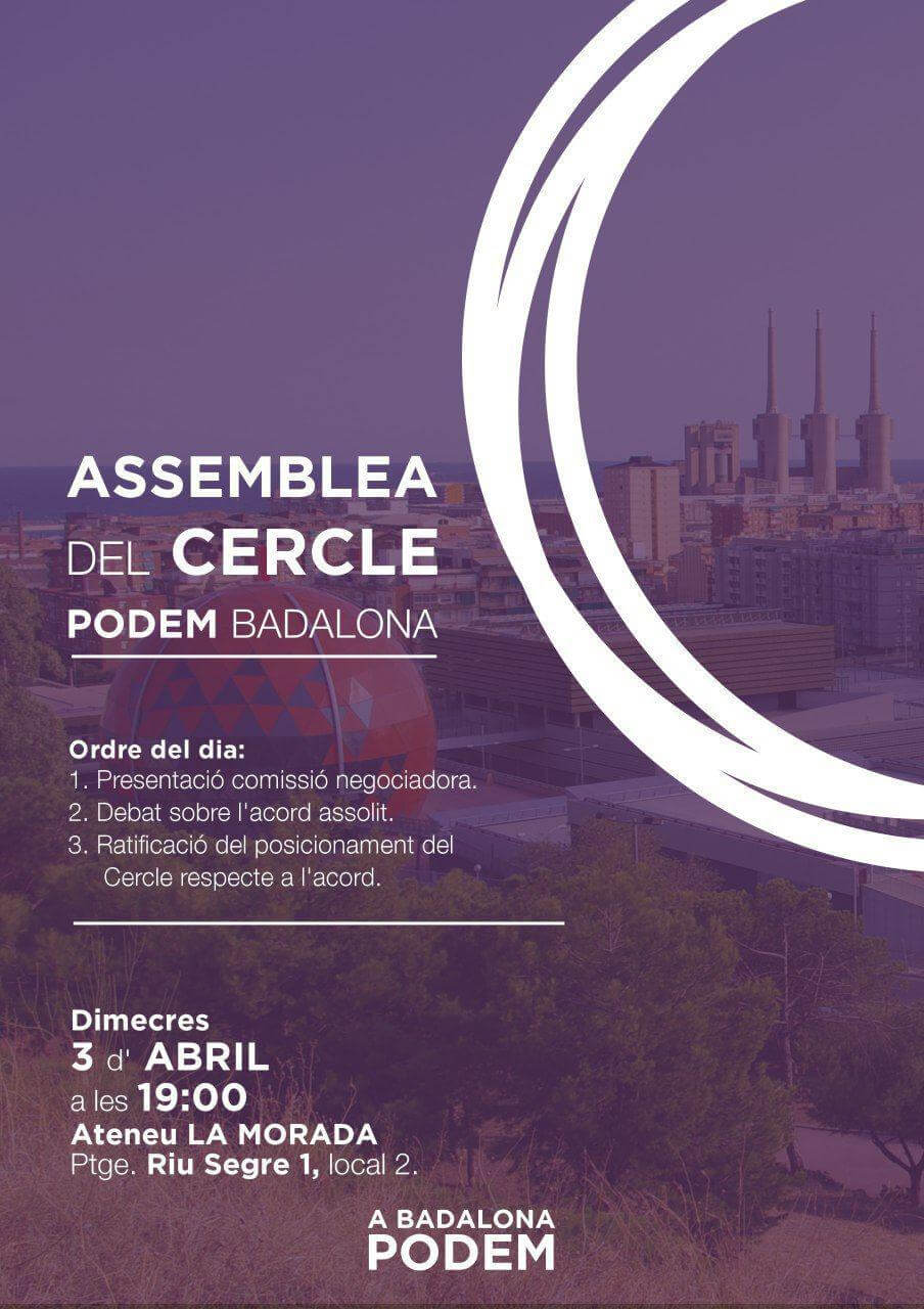 Aquests dimecres dia 3 d’abril, el Cercle de Podem Badalona ha convocat assemblea per presentar a la militància i ratificar l’acord assolit en les negociacions amb altres forces polítiques. Aquest acord, cerca constituir una candidatura amplia, en forma de coalició, de les esquerres municipals que revalidi el govern municipal del canvi que va encapçalar Dolors Sabater, segons ha explicat la formació en un comunicat.
