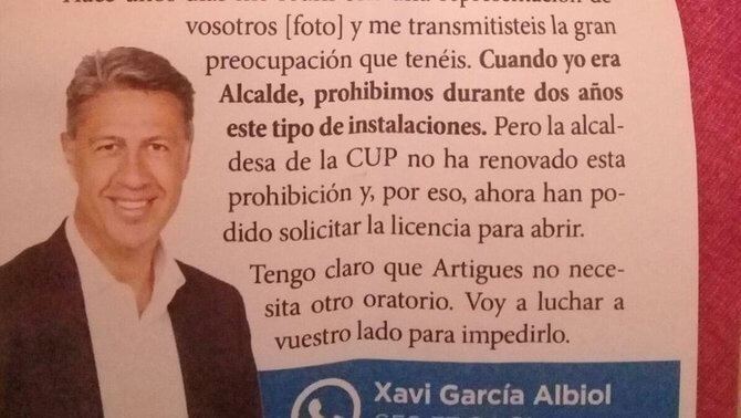 El president del PP a Badalona, Xavier García Albiol, ha sortit al pas de les acusacions afirmant que la seva formació no pretén “assenyalar cap comunitat”. Albiol ha afirmat que no es tracta d’una nova campanya, sinó que simplement volen “informar” els veïns del barri d’Artigues que ja compta amb tres oratoris més. Albiol ha explicat que el que no veuen amb bons ulls és que una zona tan reduïda concentri diversos centres de culte i ha plantejat que el nou es traslladi a altres àmbits de Badalona. Així mateix, el popular ha revelat que les obres que s’estan duent a terme de forma “irregular” perquè no disposen de la llicència pertinent.