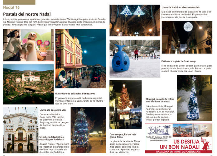 Llums, arbres, pessebres, aparadors guarnits…aquests dies el Nadal es pot respirar arreu de Badalona, Montgat i Tiana. Des del TOT, hem volgut recopilar algunes imatges molts properes en format de postals. Són fotografies d’aquest Nadal que ens evoquen a unes festes molt tradicionals.
