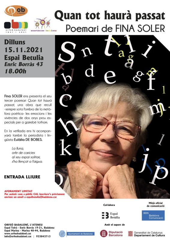 Fina Soler presentarà, aquest dilluns 15 de novembre a les 18h a l’Espai Betúlia, el seu tercer poemari Quan tot haurà passat, una obra que recull -sempre sota l’ombra de la metàfora poètica- les emocions i les vivències de dos anys prou especials per a gairebé tothom. En la vetllada ens hi acompanyarà la periodista i lingüista Eulàlia de Bobes. L’acte està organitzat per les Anastàsies de Badalona.