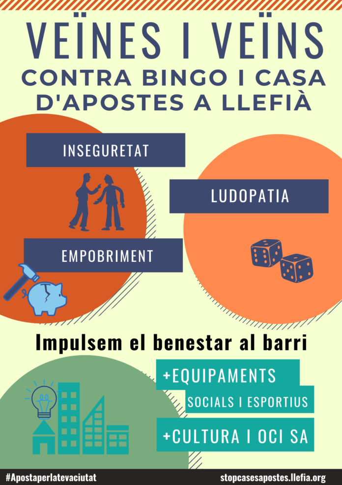 Aquest dilluns 12 d’abril s’ha realitzat la presentació de la campanya veïnal recolzada inicialment per més de 30 entitats veïnals, culturals i esportives de Llefià i de la resta de Badalona signants del manifest en contra de la instal·lació de bingo i casa d’apostes al barri a l’AV Alfons XIII 364. Les entitats reclamem una moratòria per regular aquest tipus d’establiments. Segons consideren en un manifest, aquest tipus de local comporten inseguretat, l’empobriment i la ludopatia entre el veïnatge i el teixit social del barri. El manifest reclama més equipaments socials, culturals i esportius que dignifiquin i millorin les oportunitats de lleure sa dels nostres joves i el veïnatge en general.