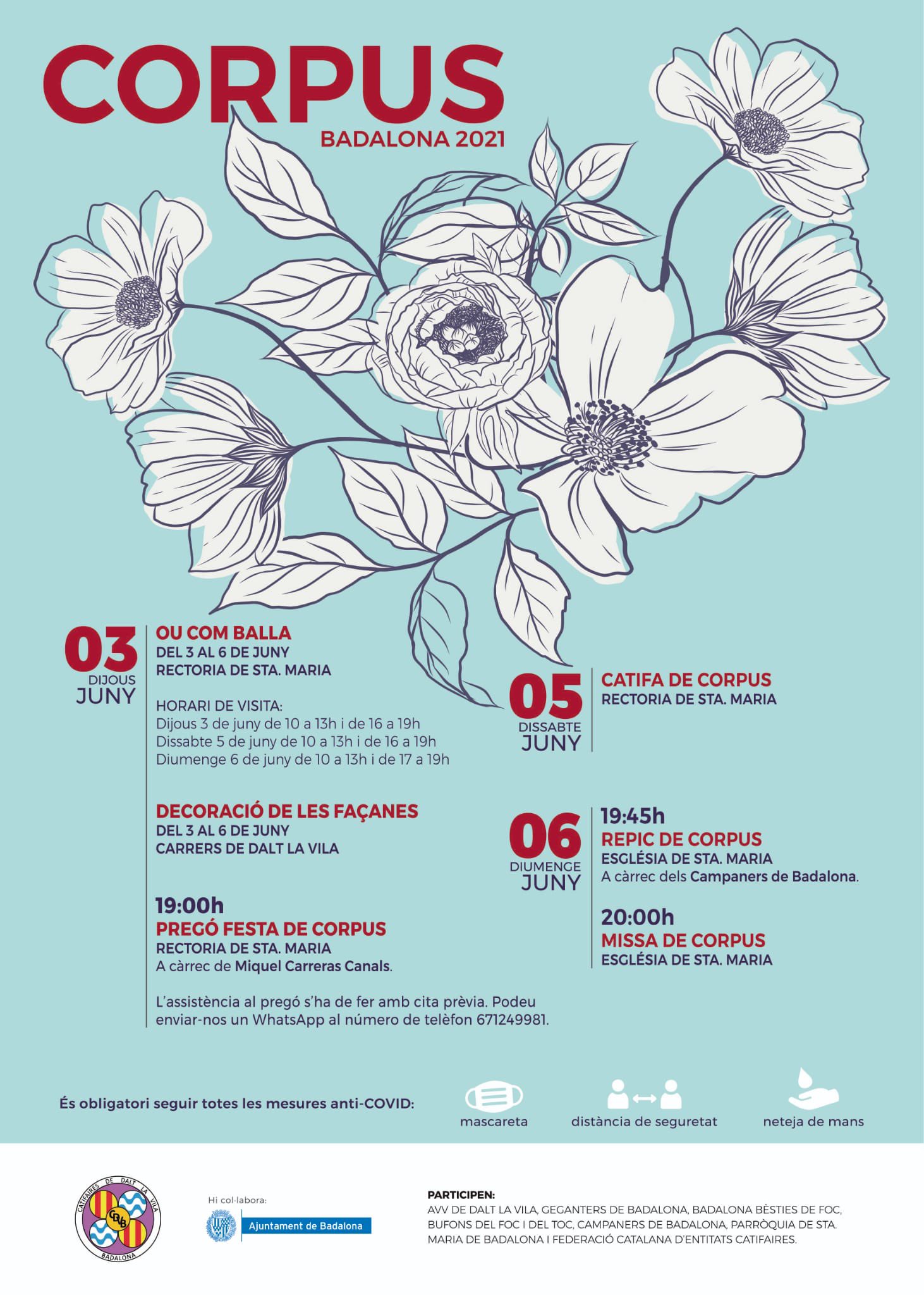La setmana vinent serà Corpus i Badalona torna a recuperar alguns dels actes tradicionals d’aquesta festivitat. El barri de Dalt la Vila serà, com cada any, l’escenari d’aquesta festivitat amb un programa farcit d’actes, gràcies a l’Associació de Catifaires de Badalona. L’any passat la festa, com gairebé totes, va quedar suspesa per la pandèmia. Enguany, l’Associació de Catifaires de Badalona està acabant d’organitzar la programació d’aquest 2021. L’entitat, però, ja ha anunciat que no hi haurà les típiques catifes de colors als carrers dels barris antics de Badalona, però si algunes de manera testimonial. Els carrers i carrerons de Dalt la Vila no fa recomanable elabora les catifes per la gran quantitat de persones que s’hi aplegaven. Tot i aquesta suspensió, l’entitat ha preparat altres actes per celebrar Corpus. No faltarà l’Ou com balla, a partir del dijous 3 de juny, a la Rectoria de Santa Maria, amb les flors i fruites que acompanyaran l’ou. Els Catifaires també han programat el pregó, enguany a càrrec del perruquer Miquel Carreras, o la Missa de Corpus, de cara a diumenge 6 de juny, a l’església de Santa Maria.
