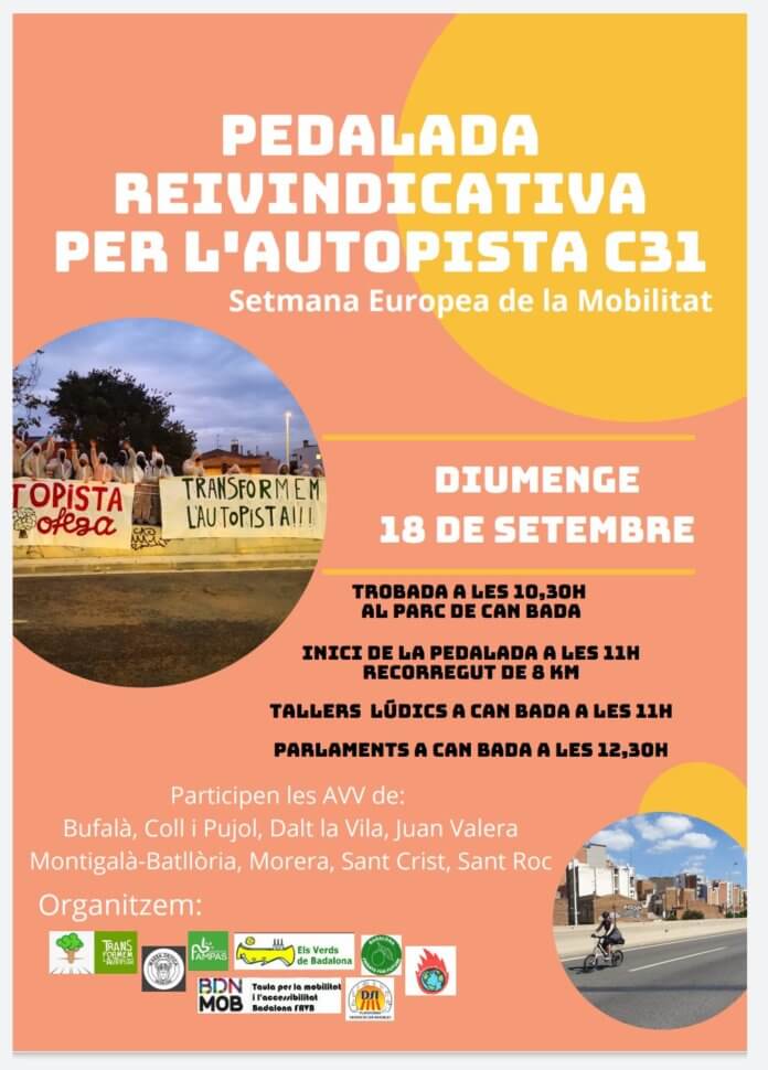 Diverses entitats i associacions de veïns de Badalona han convocat, per diumenge 18 de setembre, una pedalada reivindicativa per l’autopista C31, dins la Setmana Europea de la Mobilitat. Els actes començaran a les 10:30h al parc de Can Bada. A les 11h, segons els organitzadors, s’ha previst una pedalada d’uns 8 quilòmetres. De moment, donen suport les entitats de veïns de Bufalà, Coll i Pujol, Dalt la Vila, Juan Valera, Montigalà-Batlloria, Morera, Sant Crist i Sant Roc.
