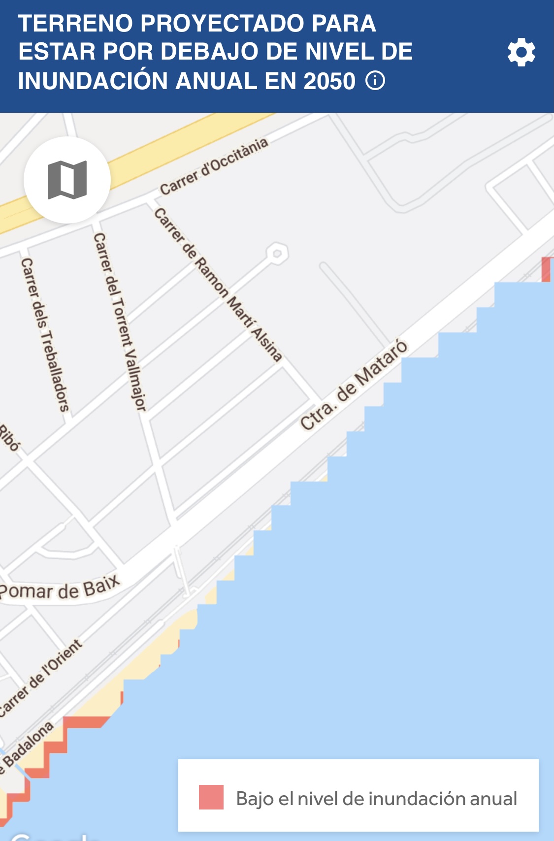 La inundació permanent de les zones costaneres serà un fet en pocs anys. Una pàgina web https://coastal.climatecentral.org/es/map/6/1.4222/39.5881/?theme=sea_level_rise&map_type=coastal_dem_comparison&basemap=simple&contiguous=true&elevation_model=coastal_dem&forecast_year=2050&pathway=rcp45&percentile=p50&return_level=return_level_1&slr_model=kopp_2014 permet ara visualitzar, a partir de les dades obtingudes pels científics a través de satèl·lits i mareógrafs, fins on pujarà el nivell de la mar en totes les ciutats costaneres del món l’any 2050. El mapa també permet veure com quedarà Badalona, segons els experts, d’aquí a menys de 30 anys. El mapa virtual reflecteix que la ciutat es quedaria sense gairebé platges i en algunes zones, com l’actual platja de la Barca Maria, el mar estaria al nivell de l’actual Carrretera de Mataró, a l’alçada del barri del Manresà, passat per sobre de l’actual traçat de la via del tren. El nivell del mar també entraria en d’altres zones, com el barri de Casagemes o a La Mora.