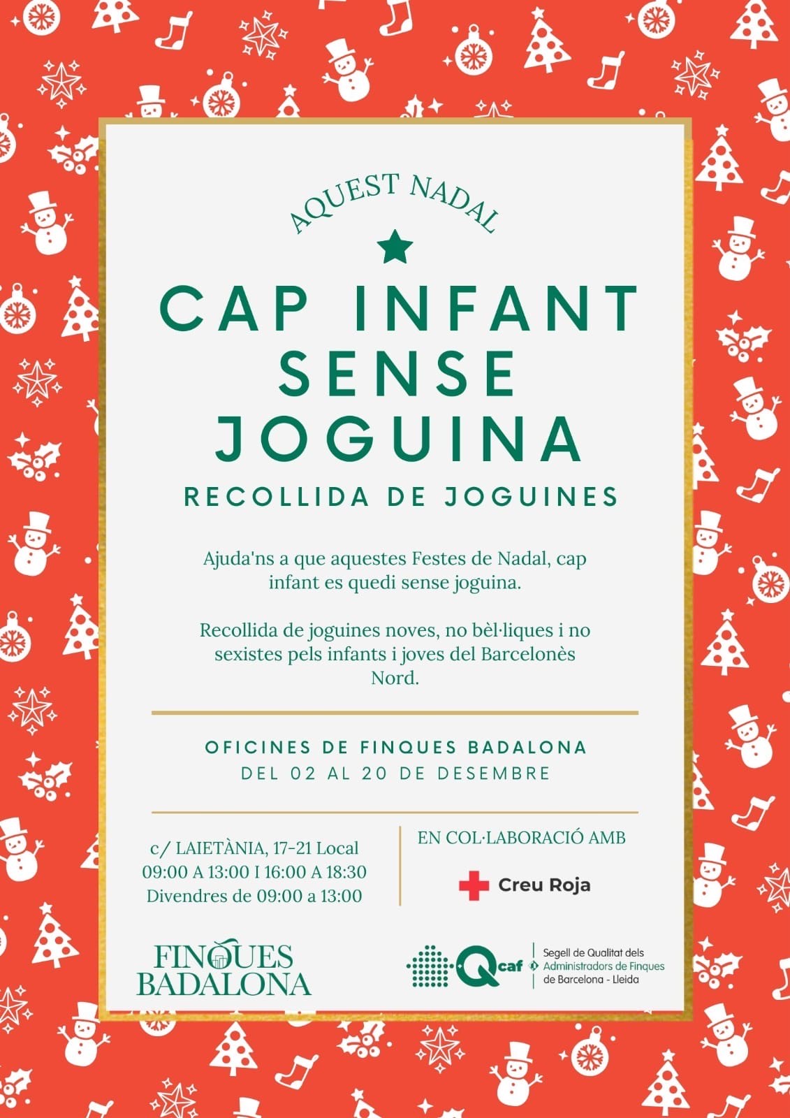Aquest Nadal, Finques Badalona organitza una recollida de joguines sota el lema “Cap infant sense joguina” per garantir que cap nen ni nena es quedi sense regal durant aquestes festes. La iniciativa, en col·laboració amb la Creu Roja, recull joguines noves, no bèl·liques i no sexistes per als infants i joves del Barcelonès Nord.