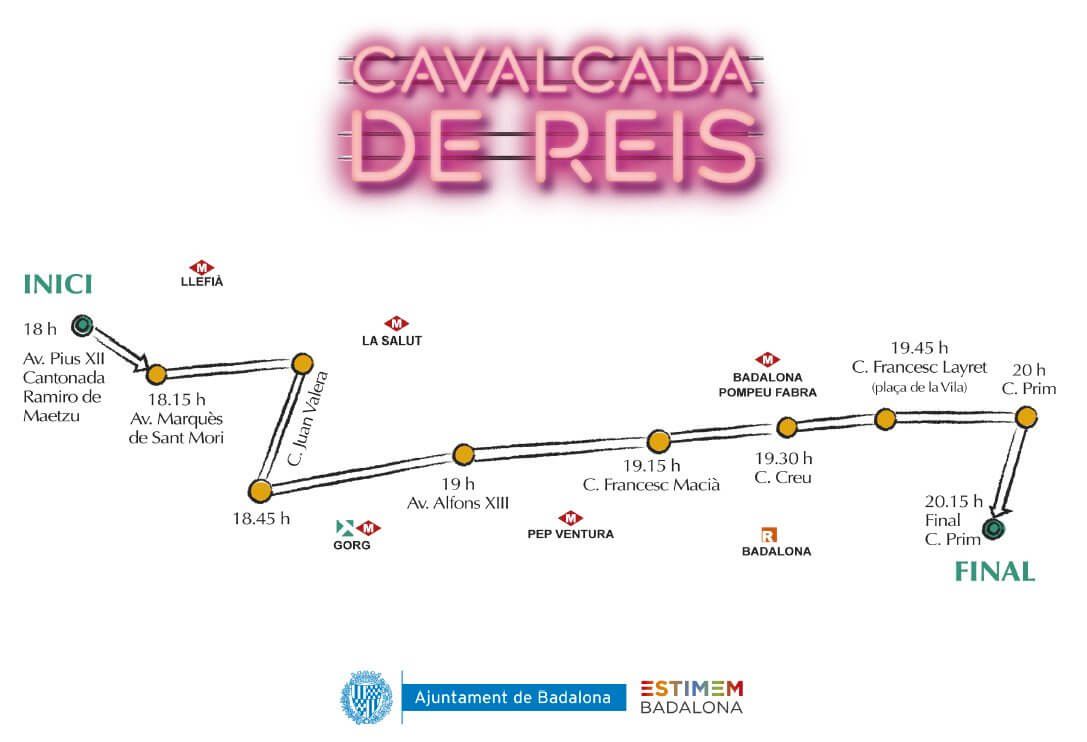 Avinguda de Pius XII cantonada amb Ramiro de Maetzu (18 h), Marquès de Sant Mori (18.15 h), Juan Valera (18.45 h), Alfons XIII (19 h), Francesc Macià (19.15 h), Creu (19.30 h), Francesc Layret (plaça de la Vila 19.45 h), Prim (20 h) i final del carrer d’en Prim (20.15 h).