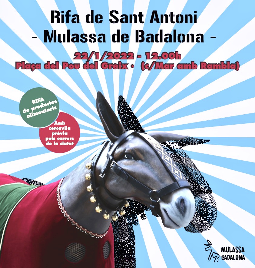 Aquest dissabte, 22 de gener, tindrà lloc una Rifa de Sant Antoni amb la Mulassa de Badalona. L’acte començarà a les 12h al final del carrer de Mar amb la Rambla. La Rifa, segons han avançat els organitzadors, serà de productes alimentaris. A més, abans de la Rifa s’ha preparat una cercavila pels carrers del Centre de Badalona.