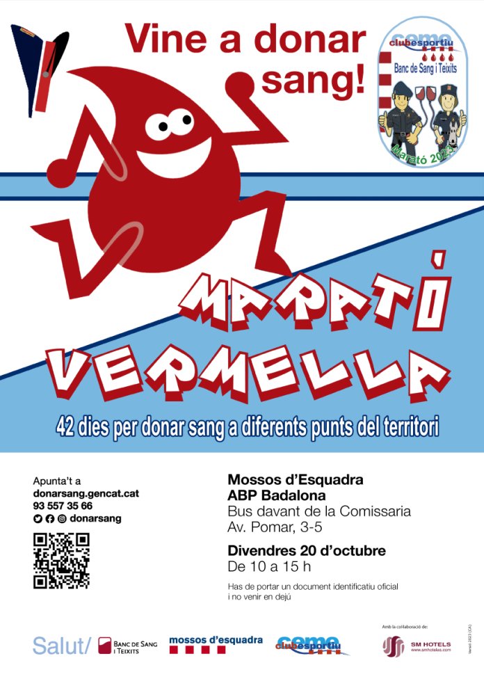 Badalona és una de les ciutats que participen en la segona edició de la campanya de donació de sang “Marató Vermella” dels Mossos d’Esquadra, una iniciativa organitzada mitjançant el Club Esportiu dels Mossos d’Esquadra ( CEME ) i el Banc De Sang i Teixits de Catalunya, amb la col·laboració de la cadena hotelera SM Hotels.