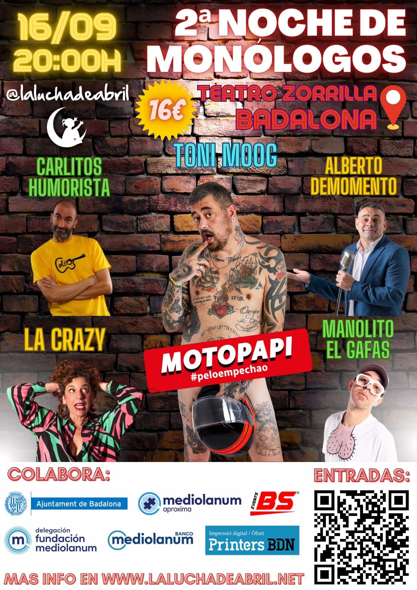 El proper 16 de setembre, a les 20h, el teatre Zorrilla acollirà la segona nit de monòlegs a favor de la lucha de Abril. Un total de 5 monologuistes actuaran a Badalona amb la finalitat de recollir fons per l’Abril. Els 5 monologuistes seran Toni Mooh, Carlitos Humorista, La Carzy, Alberto Demomento i Manolita El Gafas.