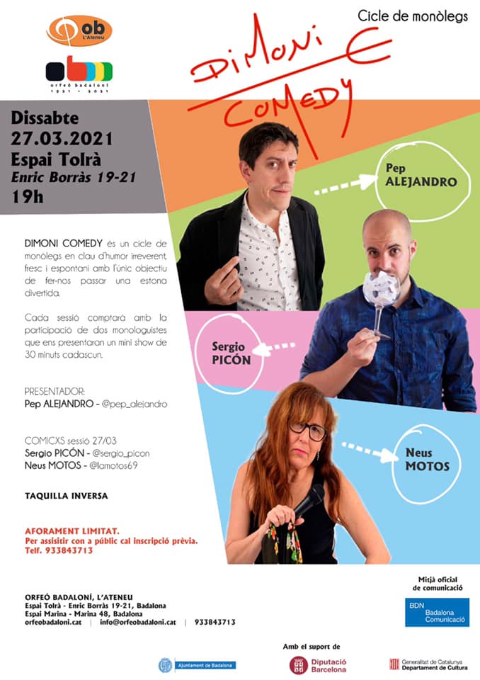 L’Orfeó Badaloní proposa la primera sessió d’un nou cicle de monòlegs que porta per nom Dimoni Comedy, un espai en clau d’humor irreverent, fresc i espontani amb un clar i únic objectiu: fer-nos riure. Per aquesta primera sessió, d’aquest dissabte 27 de març a les 19h a l’Espai Tolrà, es comptarà amb la participació de dos còmics de gran popularitat i veterans de molts escenaris d’arreu del país com són la Neus Motos i en Sergio Picón. L’espectacle serà presentat i conduït pel també cèlebre humorista Pep Alejandro.