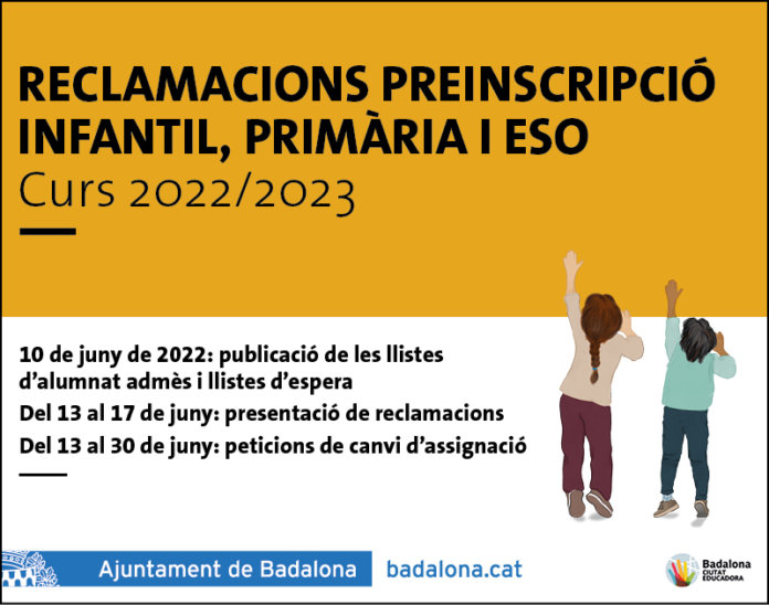 La presentació de reclamacions i les peticions de canvi d’assignació es poden realitzar a través de la seu electrònica de l’Ajuntament de Badalona. També es poden fer de manera presencial als centres educatius, a l’Oficina Municipal d’Escolarització (OME) i al registre municipal a l’edifici El Viver. El termini per a la presentació de reclamacions és entre el 13 i el 17 de juny i el de les peticions de canvi d’assignació del 13 al 30 de juny. Fins a mitjans de juliol no es disposarà de les llistes definitives d’admesos una vegada analitzats tots els casos.