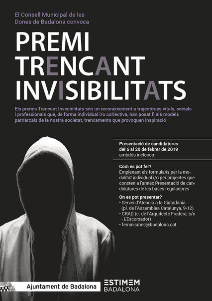 Fins dimecres 20 de febrer es poden presentar les candidatures als premis Trencant Invisibilitats que cada any concedeix el Consell Municipal de la Dona. Aquests premis s’atorguen com a reconeixement a trajectòries vitals, socials i professionals que ajudin a posar fi als models patriarcals de la societat, sigui de manera individual o col·lectiva.