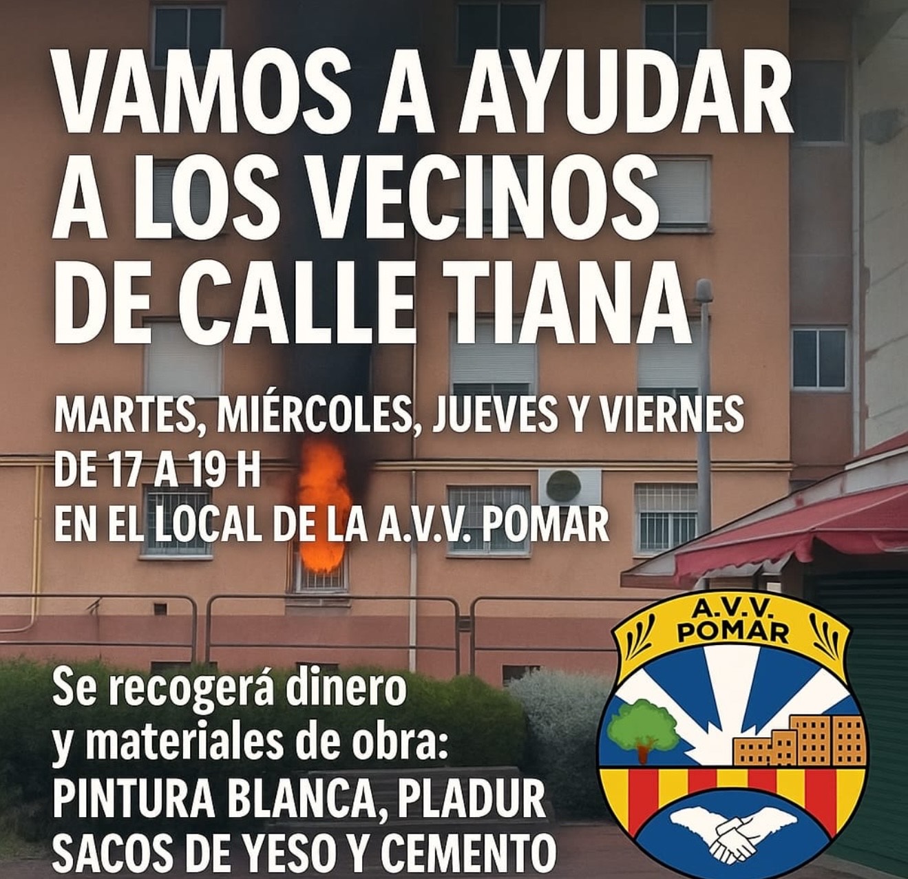 Aquest dimecres, un incendi va afectar un edifici del carrer Tiana, a Pomar, i els veïns del barri de Pomar s’han mobilitzat per donar suport als damnificats. L’Associació de Veïns i Veïnes (AV) de Pomar ha organitzat una recollida de materials i diners que tindrà lloc dimarts, dimecres, dijous i divendres, de 17 a 19 h, al seu local. Es demanen donacions de pintura blanca, pladur, sacs de guix i ciment per ajudar a la reconstrucció. La iniciativa reflecteix l’esperit solidari del barri en moments difícils.