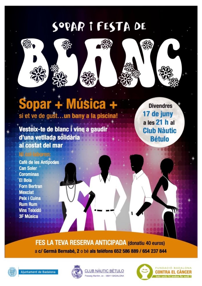 La Fundació Badalona contra el càncer ha posat en marxar el “Sopar Blanc”, que se celebrarà el divendres dia 17 de juny, a les 21 hores. L’acte del sopar més la música es farà al Club Nàutic Bétulo, situat al passeig marítim de Badalona. La compra d’entrades ja es pot fer efectiva als telèfons 652 58 68 89, 654 23 78 44, o al carrer Germà Bernabé 2 de Badalona. Per assistir al sopar, és imprescindible anar-hi vestit de color blanc i es podrà gaudir d’una vetllada solidària prop del mar, amb la possibilitat de banyar-se a la piscina.