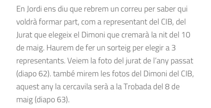 “En Jordi ens diu que rebrem un correu per saber qui voldrà formar part, com a representant del CIB, del Jurat que elegeix el Dimoni que cremarà la nit del 10 de maig. Haurem de fer un sorteig per elegir a 3 representants. Veiem la foto del jurat de l’any passat (diapo 62). també mirem les fotos del Dimoni del CIB, aquest any la cercavila serà a la Trobada del 8 de maig (diapo 63)”