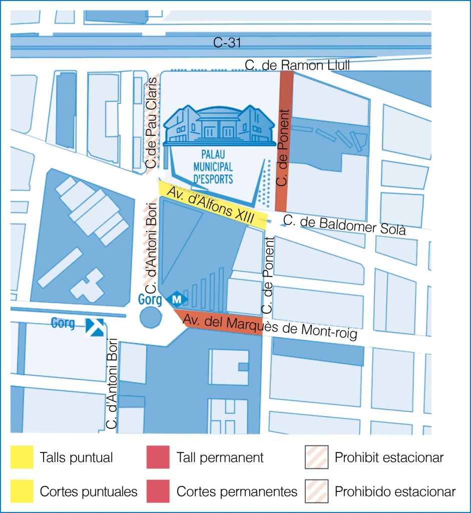 Al voltant del Palau Municipal d’Esports, del 14 al 20 de febrer es tallarà al trànsit de vehicles a l’avinguda del Marquès de Mont-roig, entre els carrers de Ponent i d’Antoni Bori, i al carrer de Ponent, entre els carrers de Ramon Llull i de Baldomer Solà. També hi haurà talls puntuals de trànsit a l’avinguda d’Alfons XIII, entre els carrers de Ponent i de Pau Claris, i estarà prohibit l’estacionament del carrer d’Antoni Bori, entre les avingudes del Marquès de Mont-roig i d’Alfons XIII, i en el carrer de Pau Claris.