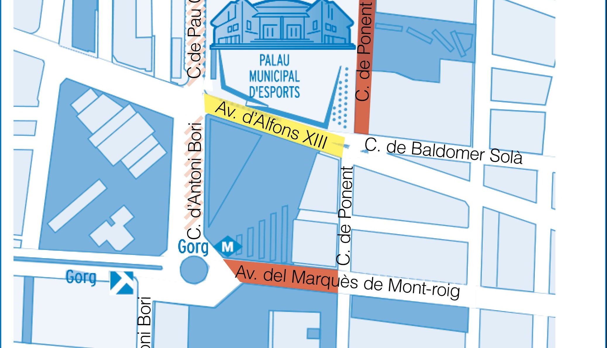 Al voltant del Palau Municipal d’Esports, del 14 al 20 de febrer es tallarà al trànsit de vehicles a l’avinguda del Marquès de Mont-roig, entre els carrers de Ponent i d’Antoni Bori, i al carrer de Ponent, entre els carrers de Ramon Llull i de Baldomer Solà. També hi haurà talls puntuals de trànsit a l’avinguda d’Alfons XIII, entre els carrers de Ponent i de Pau Claris, i estarà prohibit l’estacionament del carrer d’Antoni Bori, entre les avingudes del Marquès de Mont-roig i d’Alfons XIII, i en el carrer de Pau Claris.