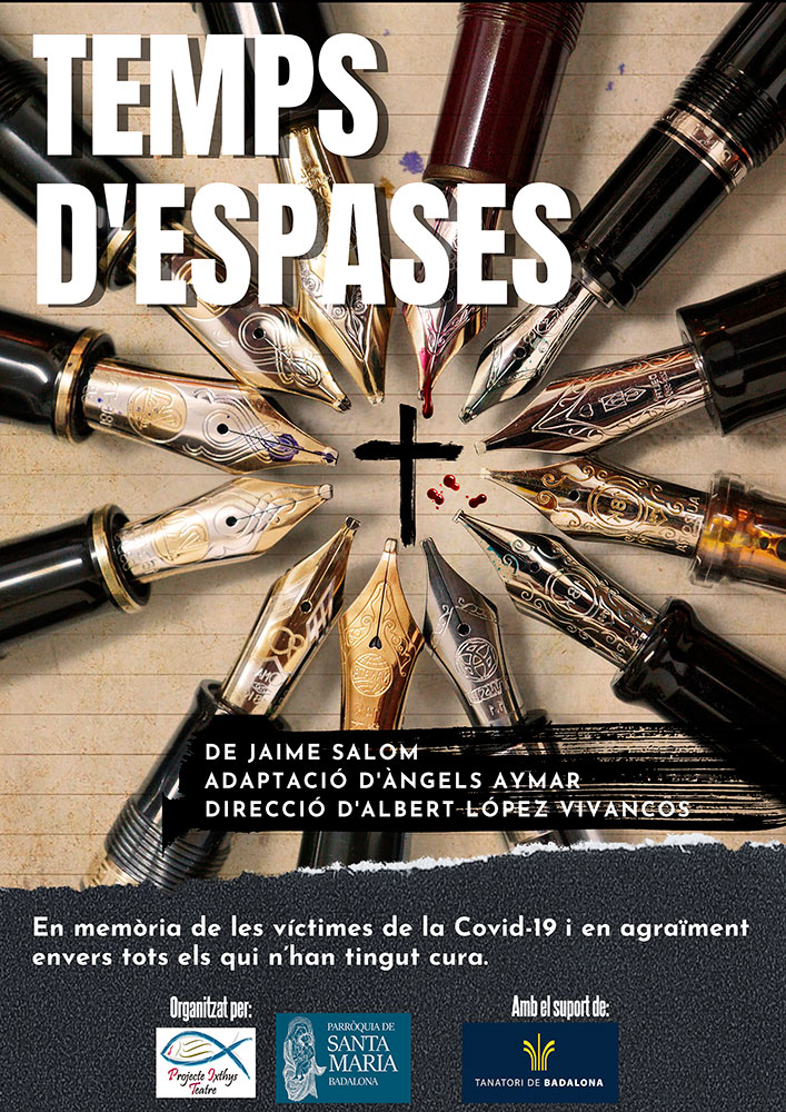PFB Serveis Funeraris dona suport a la representació de l’obra de teatre Temps d’espases, del dramaturg Jaime Salom, organitzada per la Parròquia de Santa Maria de Badalona i Projecte Ixthys Teatre. La peça s’interpretarà els dies 5 i 6 de juny de 2021 a les 17 hores, a l’Església de Santa Maria, sota la direcció d’Albert López Vivancos i l’adaptació d’Àngels Aymar. Amb Temps d’espases volen retre un homenatge especial en record d’aquelles persones que ens han deixat durant aquesta pandèmia, però també a aquelles que segueixen lluitant per fer front a la Covid-19. Perquè la cultura, a més de permetre’ns sentir-nos més a prop, és una bona medicina per a l’esperit. Estrenada fa prop de mig segle, Temps d’espases segueix sent una obra vigent, en abordar situacions i conflictes encara presents a la nostra societat. La peça situa hipotèticament l’últim sopar de Crist en els nostres dies, donant visibilitat a les inquietuds i anhels d’aquelles persones que el van envoltar abans de la mort.
