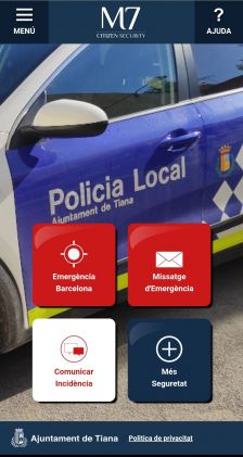 Els tianencs ja poden descarregar l’app M7 Citizen Security Tiana que els permetrà connectar de manera ràpida i senzilla amb la Policia Local. Amb aquesta aplicació només calen 2 clics per tenir una comunicació directa amb la Policia Local o qualsevol dels altres cossos de seguretat. Els grans valors de l’aplicació M7 Citizen Security Tiana són la immediatesa i facilitat que proporcionen a l’usuari. Davant d’una emergència, siguem persones joves o grans, el temps de reacció és vital, i de vegades no atinem a marcar el telèfon adequat, i el temps que perdem en trobar l’interlocutor correcte pot ser crucial per a una feliç resolució de la incidència.