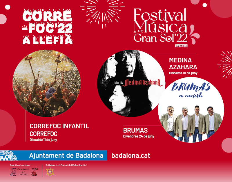 Els grups musicals Medina Azahara i Brumas seran els protagonistes de la cinquena edició del Festival de Música Gran Sol de Badalona, que enguany torna a celebrar-se després d’un parèntesi de dos anys marcats per la pandèmia. Els concerts es faran novament a l’amfiteatre del parc del Gran Sol de Llefià i seran gratuïts.