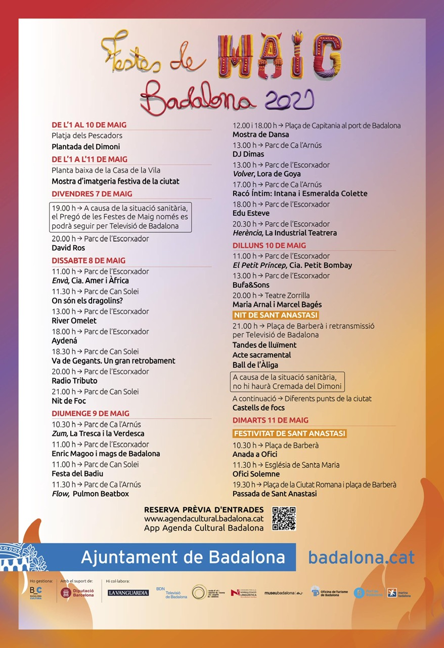 Les Festes de Maig tindran lloc del 7 al 11 de maig. El divendres 7, a les 19h, el teatre Zorrilla acollirà el pregó de festes a càrrec de les jugadores del Seagull. Aquest dilluns s’ha presentat el programa d’actes que opta per actes de petit format i amb reserva d’entrades prèvia i aforament limitat. Les entrades es podran adquirir, des d’aquest dilluns, a través del web http://www.agendacultural.badalona.cat o bé de l’aplicació mòbil “Agenda Cultural Badalona”. Trobareu aquí, en la imatge, tots els actes programats.