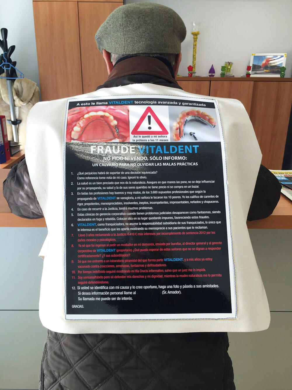 Aquesta setmana hem conegut la detenció de part de la cúpula de les clíniques dentals Vitaldent per frau i blanqueig de diners. A Badalona, aquesta clínica disposa de dos establiments. Justament, un badaloní porta des de l’any 2009 una creuada personal contra aquests establiments perquè segons diu la pròtesis dental que li van posar a la seva dona va quedar em mal estat en pocs mesos. L’Amador porta cada dia un cartell, a la seva esquena, denunciant aquests fets i demanant explicacions a la cadena de clíniques.