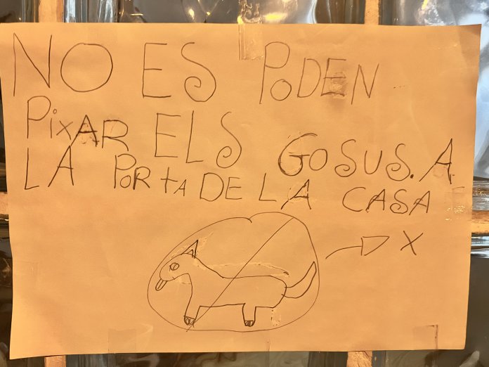 Al barri de Casagemes, un infant ha fet un cartell ple d’estima, però amb un missatge molt clar: no vol que els gossos pixin a la porta de casa seva. El cartell, escrit en català amb lletres grans i dibuixat a mà, diu: “No es poden pixar els “gosus” a la porta de casa”, deixant ben clar que els propietaris de gossos han de tenir cura de no deixar que els seus animals facin les seves necessitats davant casa seva. A més, l’infant ha afegit un dibuix d’un gos, amb un gran símbol de prohibició al voltant. Aquest missatge, que barreja la innocència infantil amb una preocupació ben seriosa, ha cridat l’atenció dels veïns.