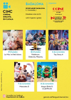 Cinc pel·lícules familiars i per a tots els públics, acabades d’estrenar, per distreure nens i adults les tardes de dissabte. Aquesta és la proposta que ofereix el Centre de Normalització Lingüistíca de Badalona i Sant Adrià de Besòs. Els cinemes del Màgic és la sala on és projecten les pel·lícules. Aquest dissabte, 2 de novembre, podrem veure el film “Toy Story 4”, a les 16:15h als cinemes badalonins.