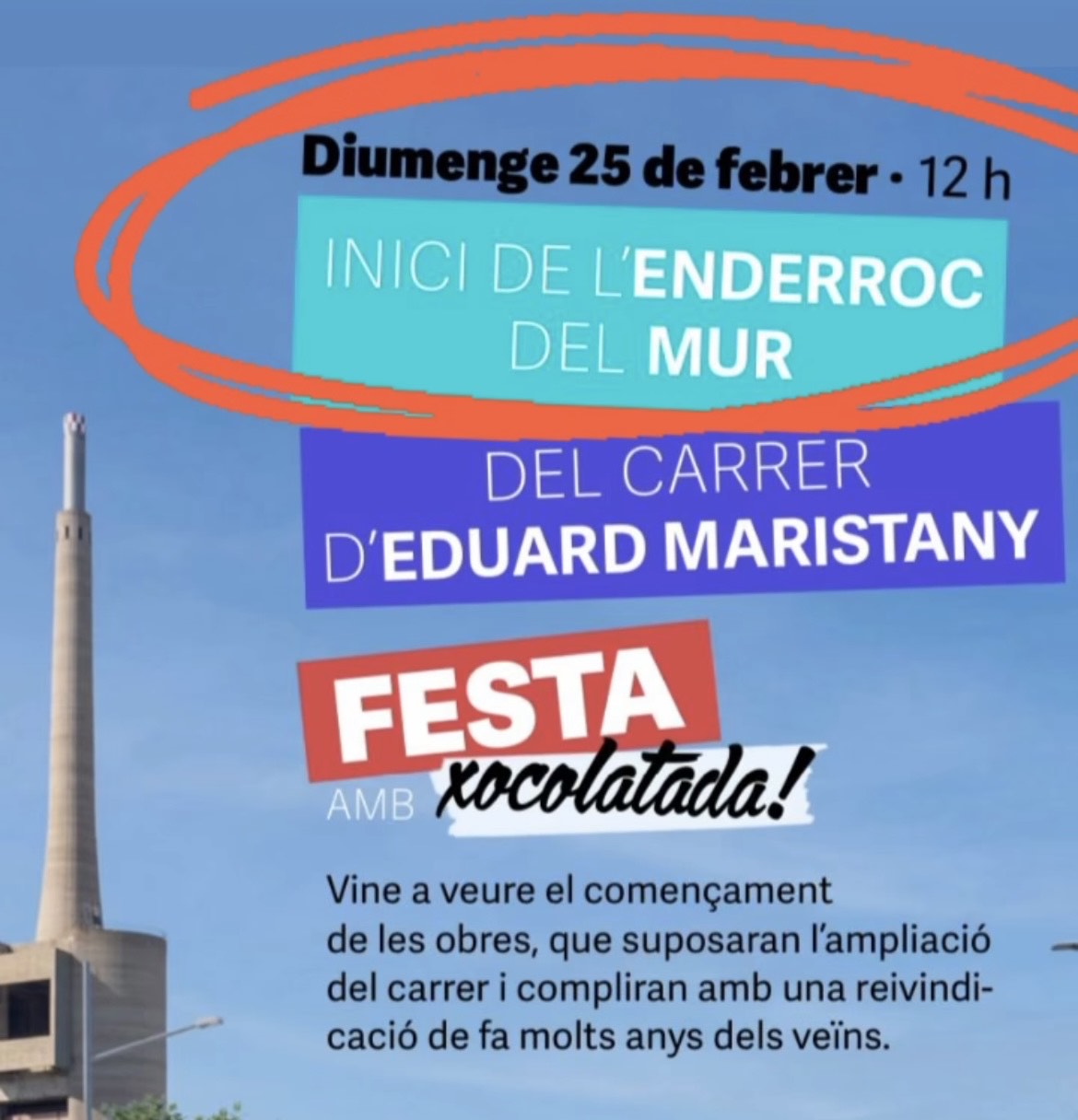 L’alcalde de Badalona, Xavier Garcia Albiol, ha anunciat, aquest dimarts, una festa amb xocolatada gratis per a tothom per celebrar, segons anuncia, que s’enderroca el mur d’Eduard Maristany. La festa tindrà lloc aquest diumenge, a les 12h, al mateix carrer Eduard Maristany, al barri de la Mora. Recordem que les obres d’enderroc, finançades per l’AMB, s’han anunciat en diverses ocasions durant els darrers anys. De moment, els operaris ja treballen en l’interior del mur de les tres xemeneies.