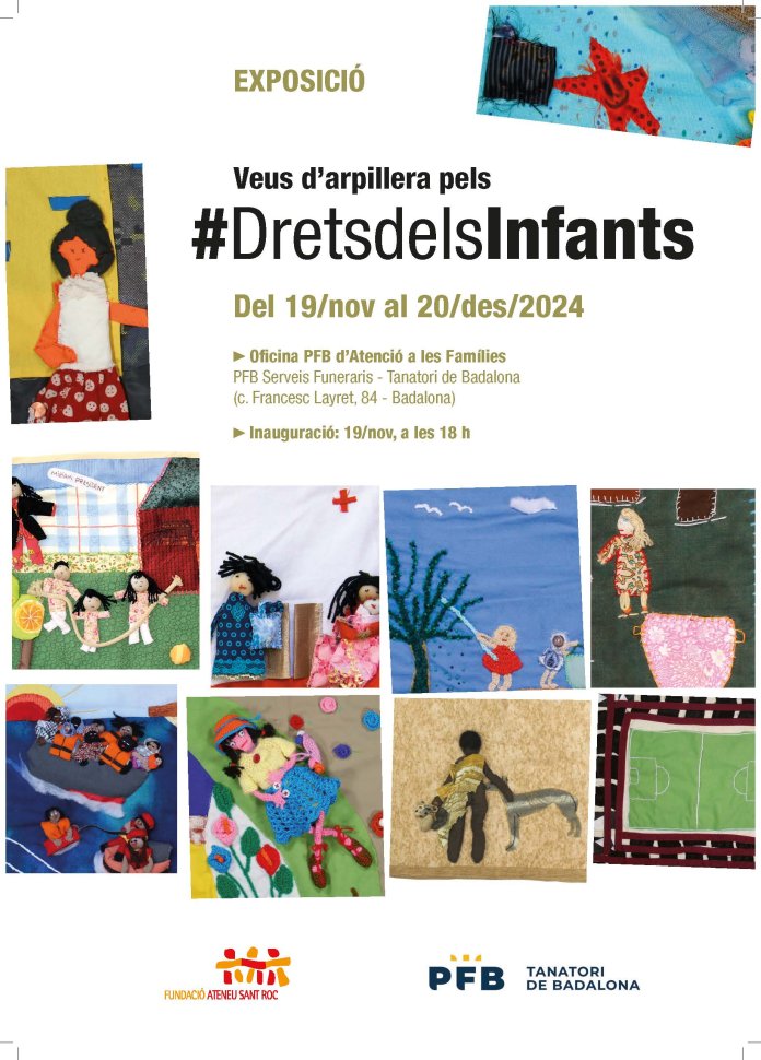En el marc la Setmana dels Drets dels Infants, PFB Serveis Funeraris, a través del Tanatori de Badalona, i la Fundació Ateneu Sant Roc us convidem a la inauguració de l’exposició Veus d’arpillera pels #DretsdelsInfants, que tindrà lloc aquest dimarts 19 de novembre, a les 18 hores, a l’Oficina PFB d’Atenció a les Famílies del centre de Badalona (c/ Francesc Layret, 84).